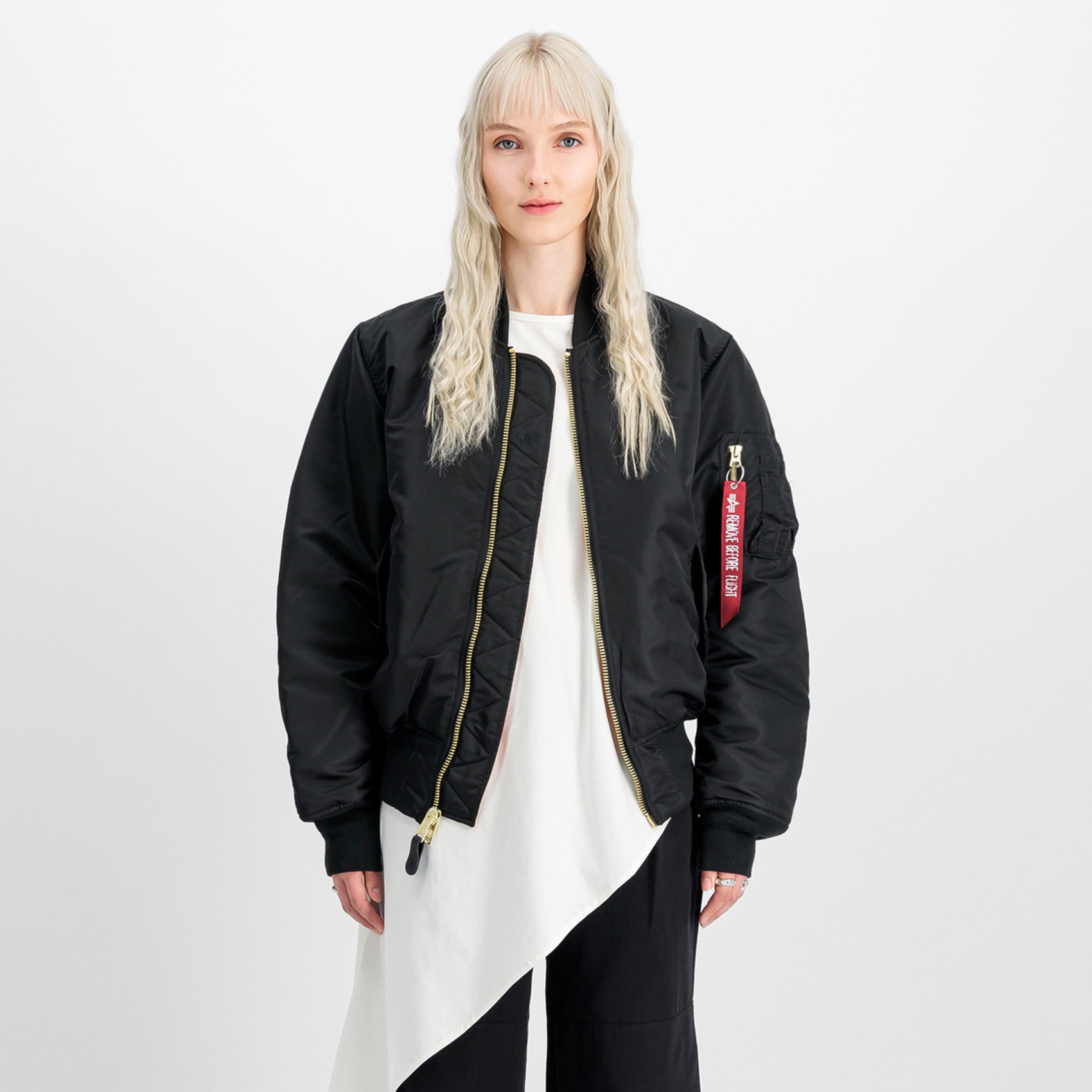 - goldener Reißverschluss mit Lederlasche und das Flag Label am Ärmel